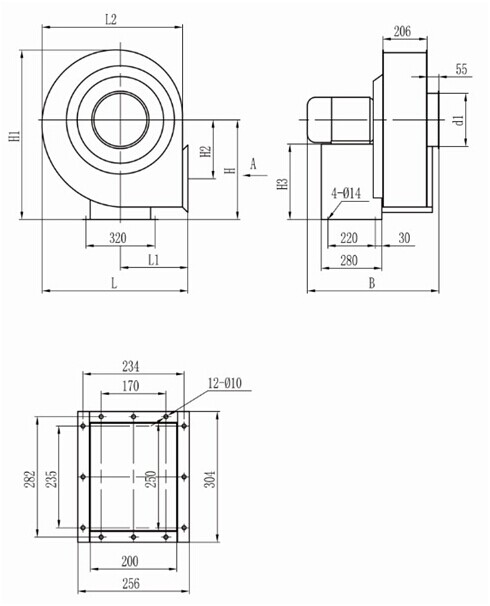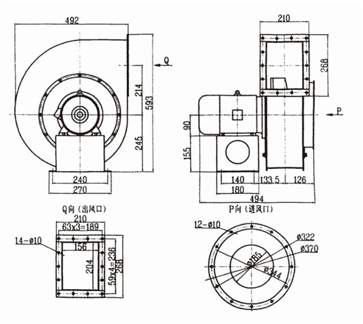 用戶使用時,風(fēng)機可安裝于地面,小風(fēng)機也可直接安裝于纖維分離器、集塵器等設(shè)備或墻壁旁的支架上。(結(jié)構(gòu)尺寸詳見下頁)